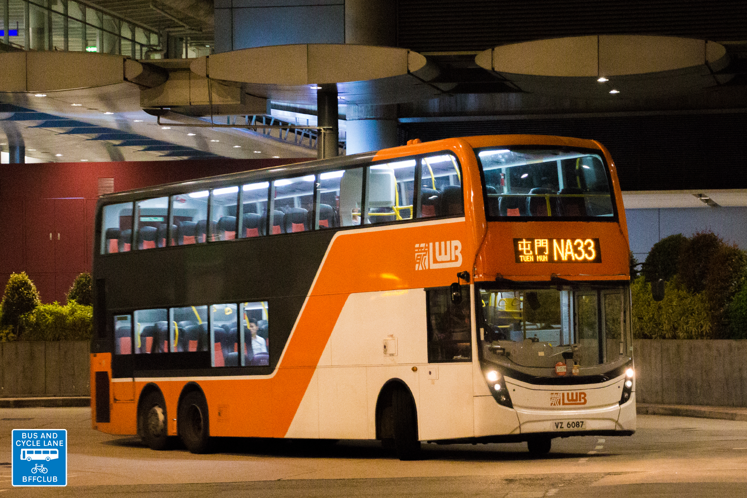 The Overnight Airbus Route NA33 is operated by Long Win Bus (LWB). It runs between Cathay City and Tuen Mun (Fu Tai) during daily overnight hours, which passes through Airport Passenger Terminal Building and HZMB Hong Kong Port before crossing the Tuen Mun Chek Lap Kok Tunnel Road to and from Butterfly Beach, San Shek Wan, On Yau, Tuen Mun Town Centre, MTR Tuen Mun Station, Tai Hing, Leung Tin, Wo Tin Estate, Ching Tin Estate, Yan Tin Estate and Siu Hong Court.