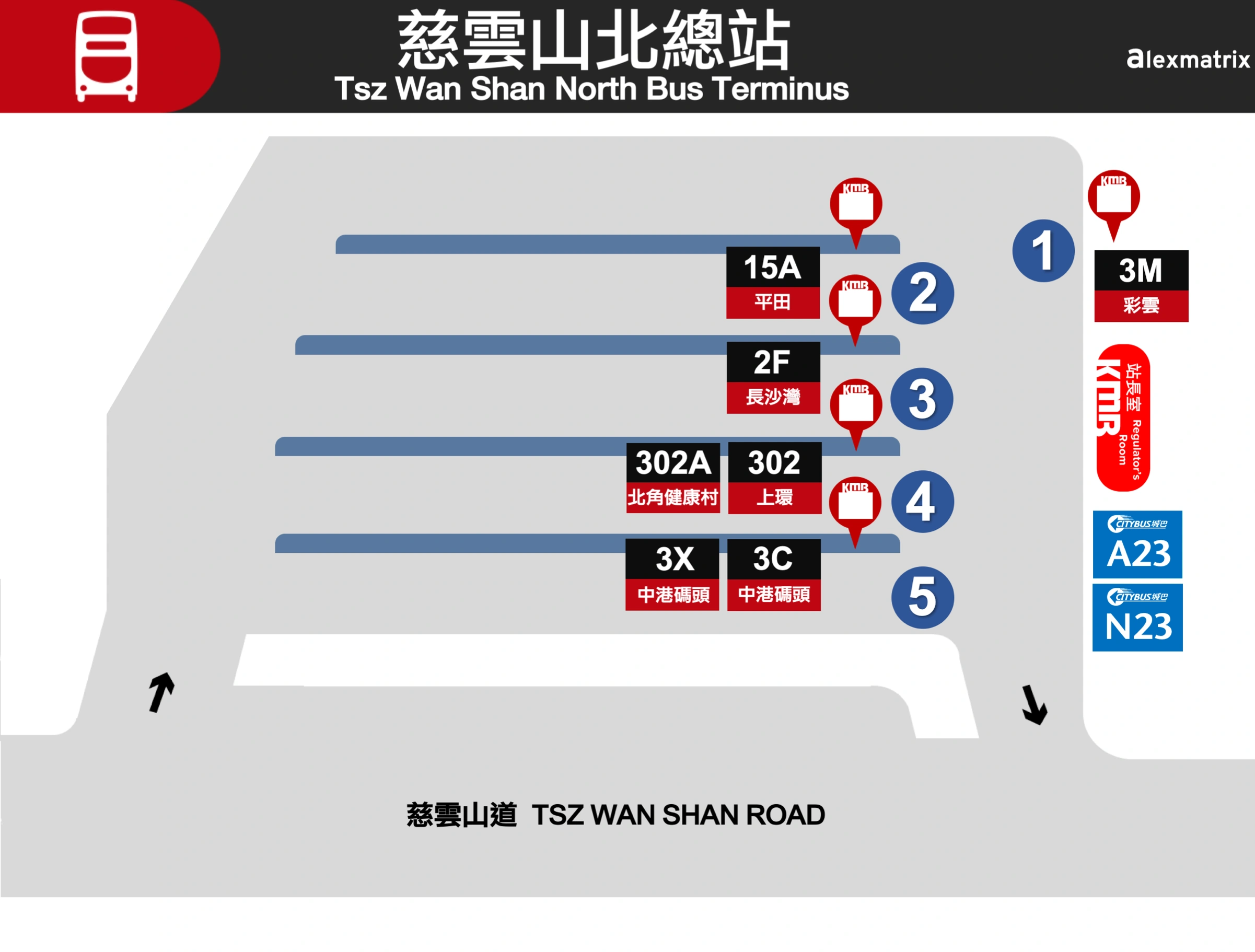 - ↑ The Kowloon Motor Bus Company (1933) Limited, "2F, 3C, 3M, 3X, 15A, 302, 302A 慈雲山(北)巴士總站臨時安排" [Passenger Notice], September 2023.